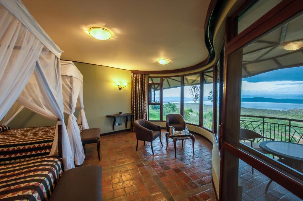 The lodge also overlooks Lake Nakuru and its surrounding National Park, a paradise for bird watchers and wildlife lovers alike.