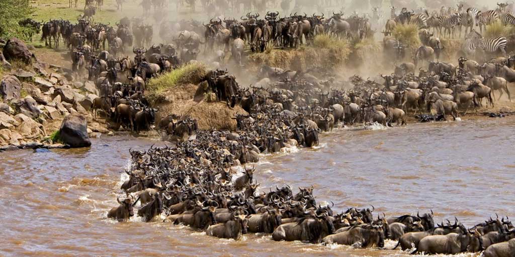 The Great Migration is the movement of thousands of wildebeest from Serengeti in Tanzania into Masai Mara Reserve in Kenya. It is one of the world’s most spectacular and thrilling displays of wildlife behavior.