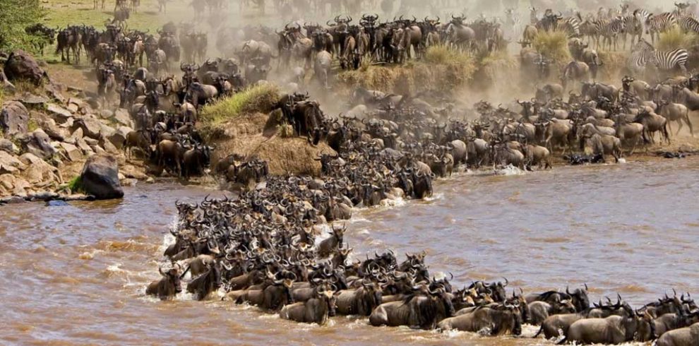 The Great Migration is the movement of thousands of wildebeest from Serengeti in Tanzania into Masai Mara Reserve in Kenya. It is one of the world’s most spectacular and thrilling displays of wildlife behavior.